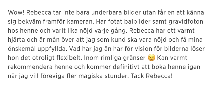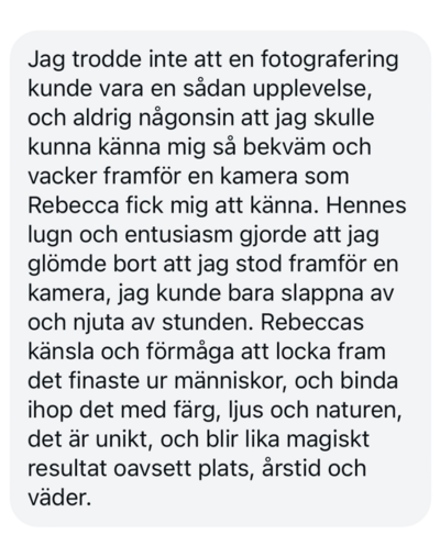 Jag heter Rebecca - fotograf, känslomänniska och kreativ nattuggla som trivs bäst med något att skapa. Jag är lugn, tålmodig och bra på att läsa av stämningar, oavsett om det handlar om ett blygt barn, ett busigt syskonpar eller någon som helst inte vill stå framför kameran.