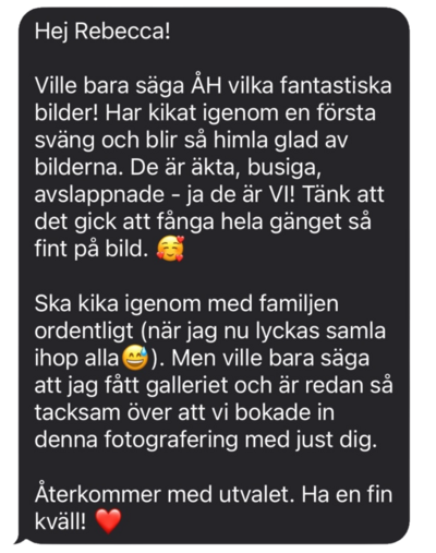 Inom 14 arbetsdagar får du ett urvalsgalleri via mail, där du i lugn och ro kan välja vilka bilder du vill köpa till.